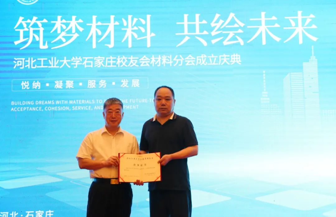 河工大石家莊校友會(huì)韓杏軍會(huì)長(zhǎng)為材料分會(huì)會(huì)長(zhǎng)唐永忠頒發(fā)備案證書