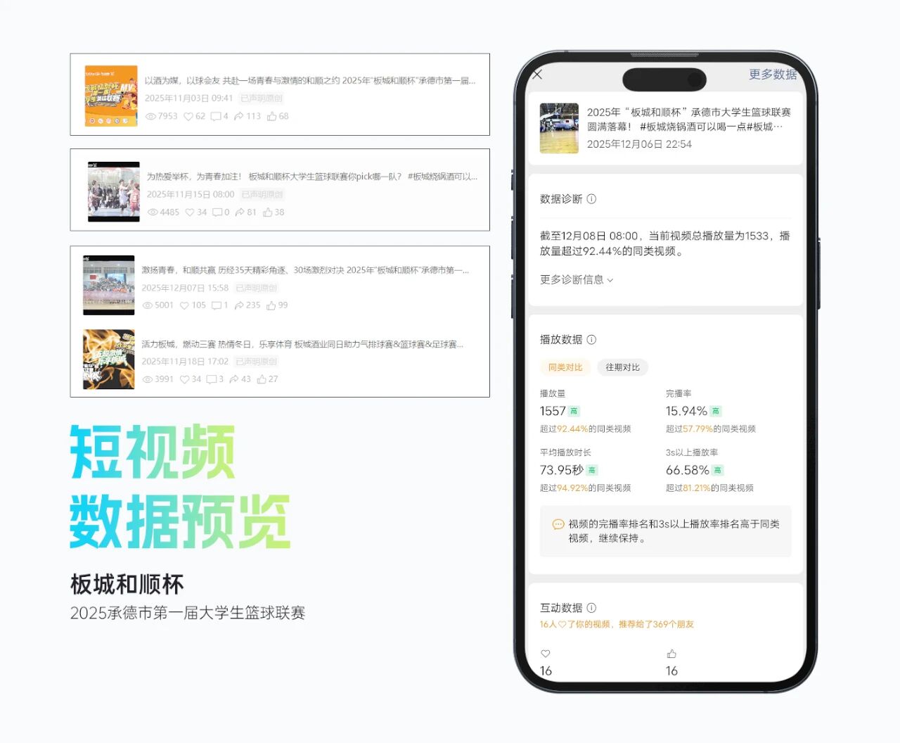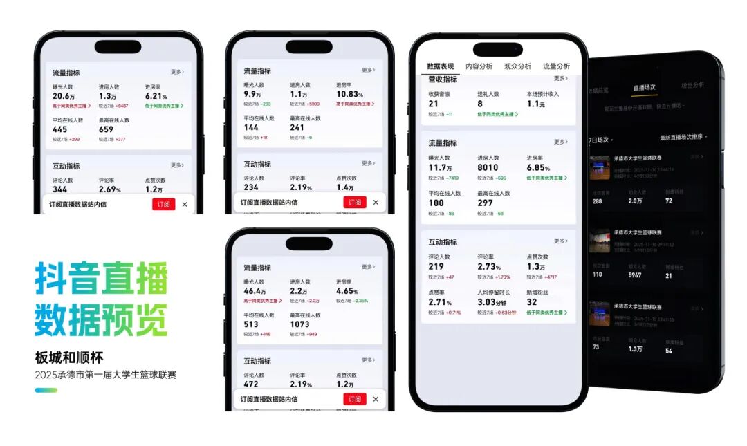 整體活動(dòng)影響力顯著,賽事抖音曝光超214萬(wàn),累計(jì)觀(guān)看直播人數(shù)超15萬(wàn)人,現(xiàn)場(chǎng)累計(jì)吸引觀(guān)眾逾2萬(wàn)人次,承德市籃球協(xié)會(huì)微信公眾號(hào)相關(guān)閱讀量超2萬(wàn)人次,板城酒業(yè)視頻號(hào)平臺(tái)相關(guān)播放量超2.5萬(wàn)人次。