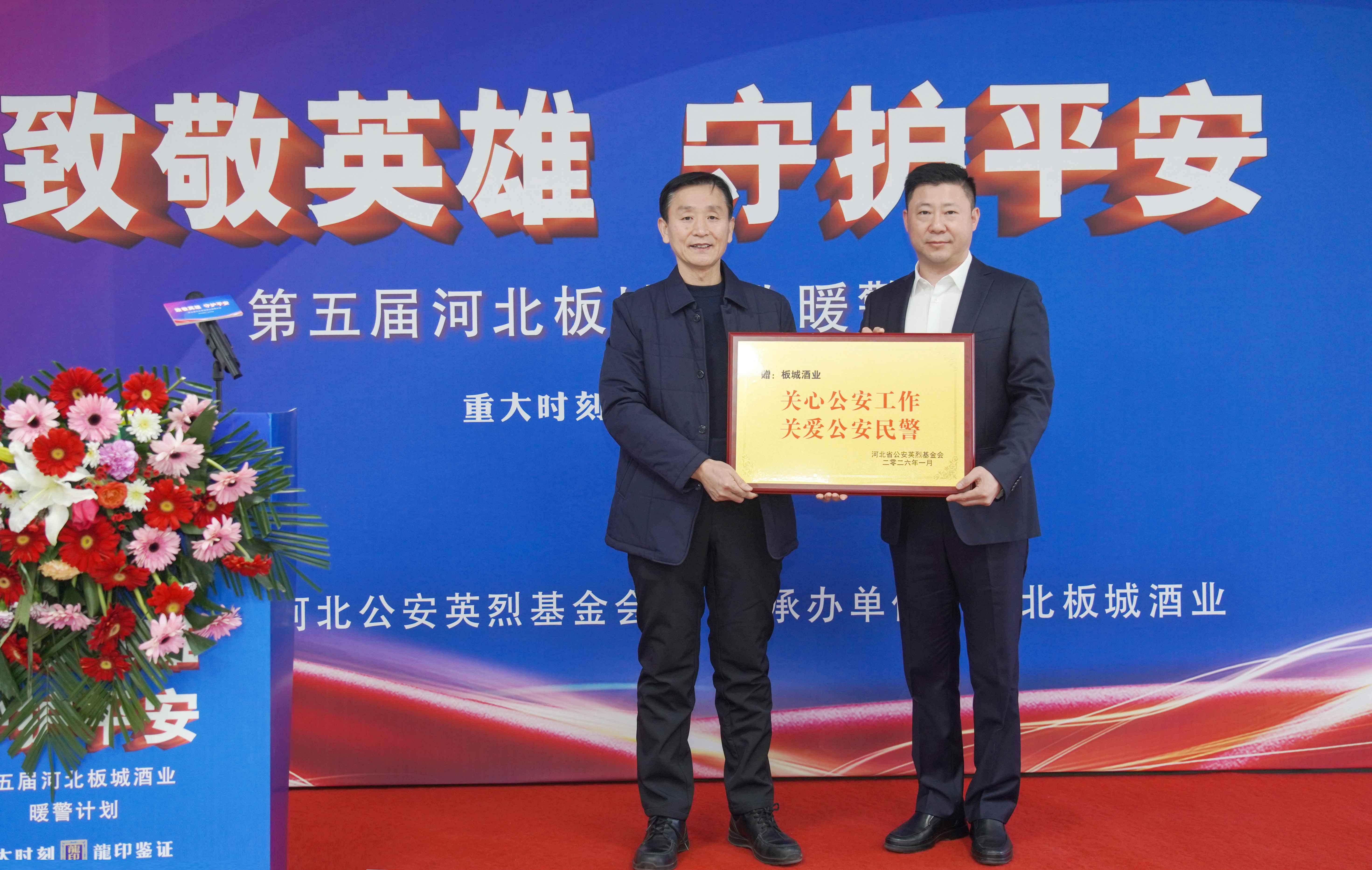 河北省公安英烈基金會副理事長崔際尚向板城酒業(yè)授予愛心企業(yè)牌匾。
